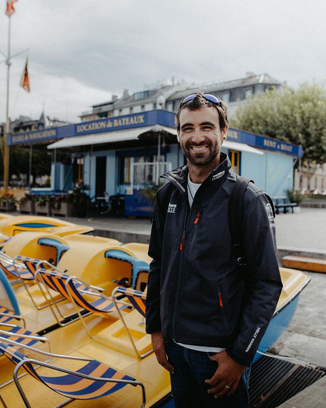 Boats are still his home when he is not spending his few days off with his wife and his daughter in a small house in Brittany or visiting his family and friends, who still live in his hometown, Geneva. The arrival at Port-Noir Harbour is always a kind of homecoming for Alan. His closest friends live and work there, and so he visits them boat by boat. Over a cup of coffee on board, they talk shop in sailor jargon about an object of desire. He also pays a visit to the old cutter L’Almyr. There we encounter his friendly father, who today continues the Roura family tradition and is treating himself to a shower – in other words his daily morning bath in Lake Geneva in water that is 10 degrees Celsius. For true sea bears this is not a problem – even when the outdoor temperature is below zero. A stop to see Alan’s friends at Les Corsaires boat rental, a small blue house with yellow pedalos right by a landmark of Geneva, cannot be skipped. This place has stood still in time. Since Alan’s childhood, the building has stood on the lakeside promenade and contrasted with the constantly changing city.
